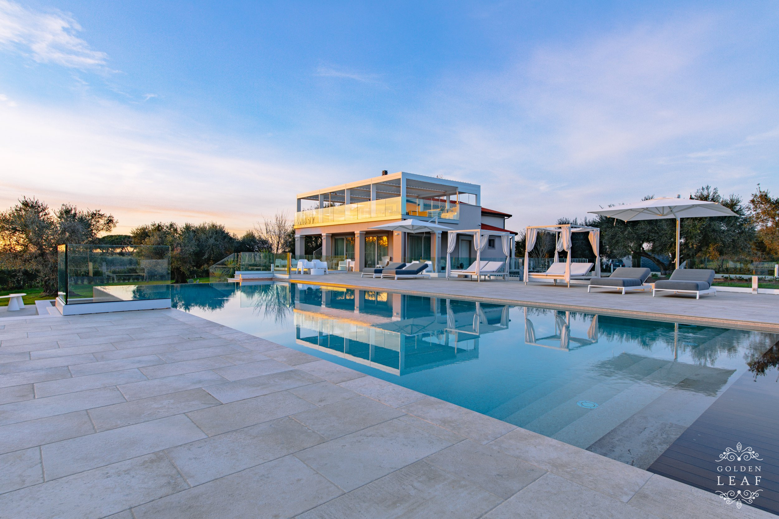 The swimming pool designed with modern features and clean lines; white marble for the flooring of the solarium on which they insist, sun loungers, armchairs and sofas sheltered by a gazebo and equipped with a shower and changing room, surrounded by the olive trees protagonists with their wise and elegant rare beauty.